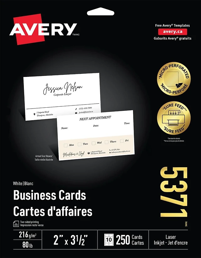Avery Business Cards with Sure Feed Technology, Micro-Perforated, 2" x 3 ½" , for Laser and Inkjet Printers - 5371