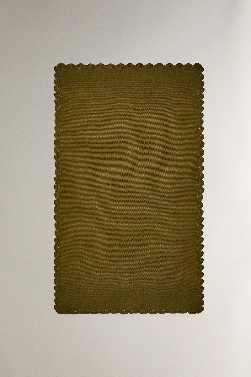 Baby blanket made of cotton knit, with a wavy crochet trim.