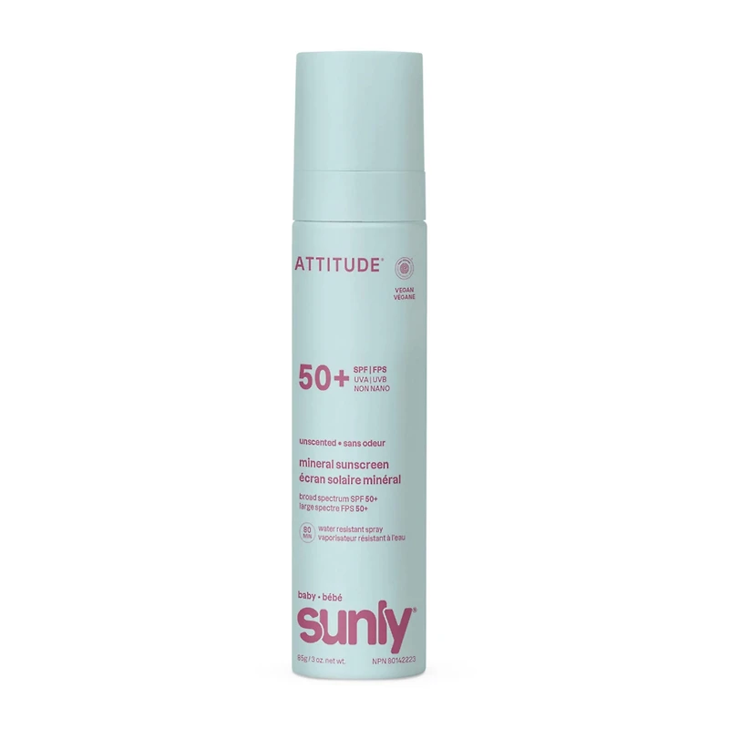 Spray and go. Our Sunly® SPF 50 non-aerosol mineral baby sunscreen spray delivers high-performance coverage in seconds with an ultra-light feel. Powered by non-nano zinc oxide, this sunscreen for babies provides 80 minutes of water-resistant protection against UVA and UVB rays.