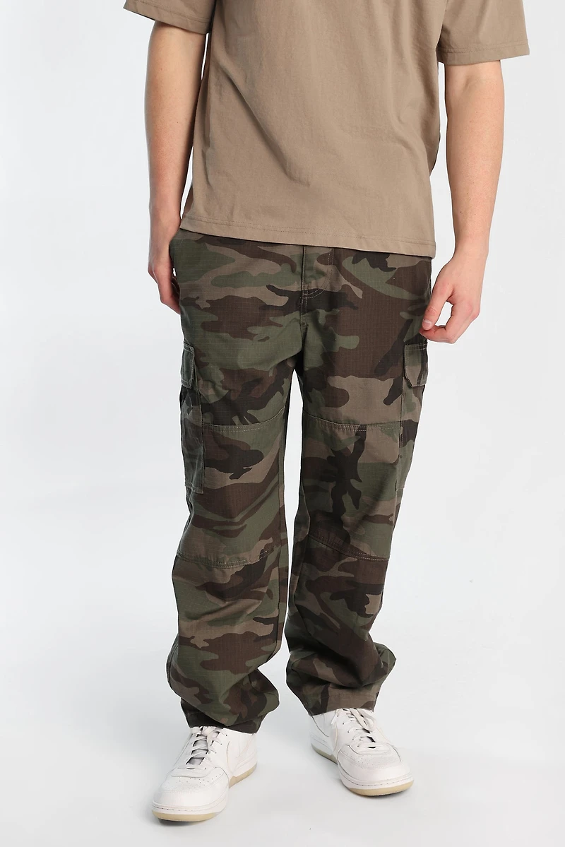 Non-stretch ripstop fabric2 side slanted pockets, 2 back pockets, 2 cargo pockets5 belt loopsZipper fly with button closureBaggy skater fit65% Polyester, 35% CottonMachine wash inside out in cold water - Gentle with like colours - No bleach - Tumble dry low - Low iron on reverse sideImportedStyle #0614-56182618