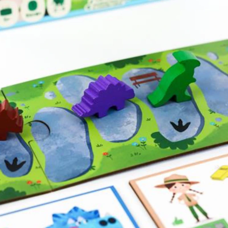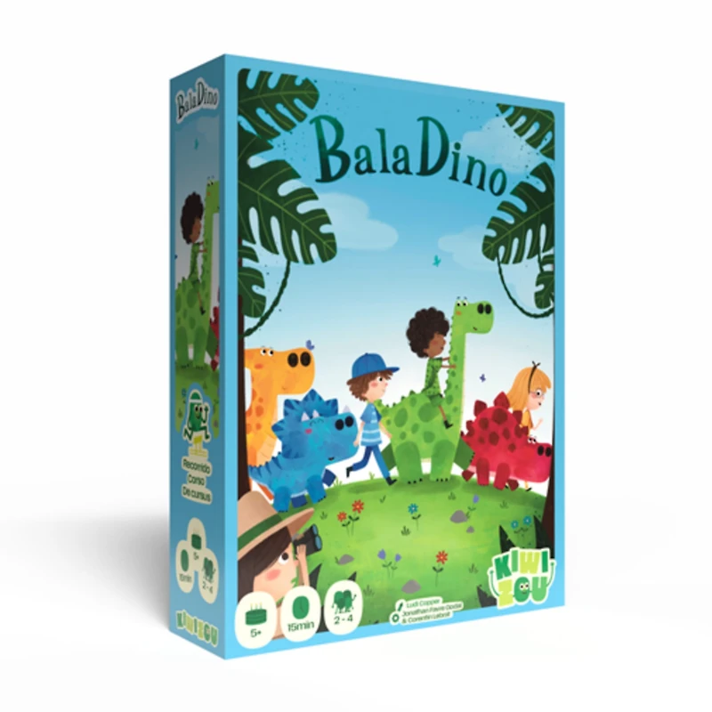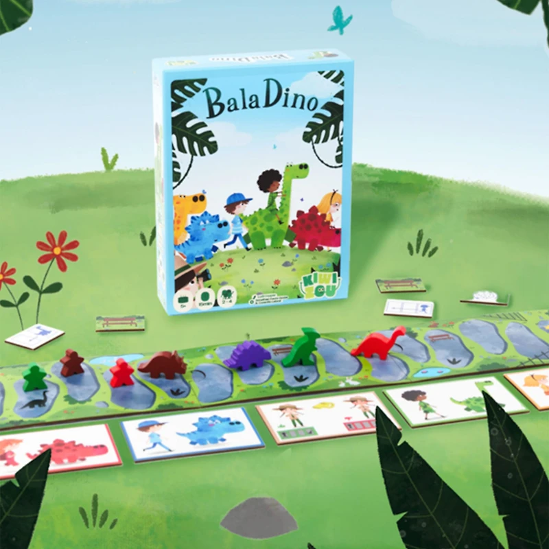 It's walk day at Dino Parc! The masters are out and about, accompanied by their faithful pet Dino. A competition soon ensues: which Dino will be the fastest to reach the park gates? They all set off down the central alley, but watch out for Billy, the park keeper, who can't bear to see the dinos too far from their master! In Baladino, players take on the role of masters who take their pet Dino for a ride. A race is organized in the central alley of Dino Park, and the first Dino to reach the end of the alley is declared the winner. Each player must manage the progress of 2 pawns: his Dino pawn AND his Master pawn. To advance, players roll the die and move either their Dino or their Master piece. To win the game, only the Dino counter counts, and it would be logical to move only that counter, BUT that's where Billy, the park keeper, comes in! Billy is strict and can't stand the Dinos being too far from their Master. When a player gets the whistle on the dice, if his Dino is more than 3 squares in front of his Master counter, he must move his Dino back to the same square as his Master. It's up to each player to use his or her own daring or cautious technique to move forward and win the race!