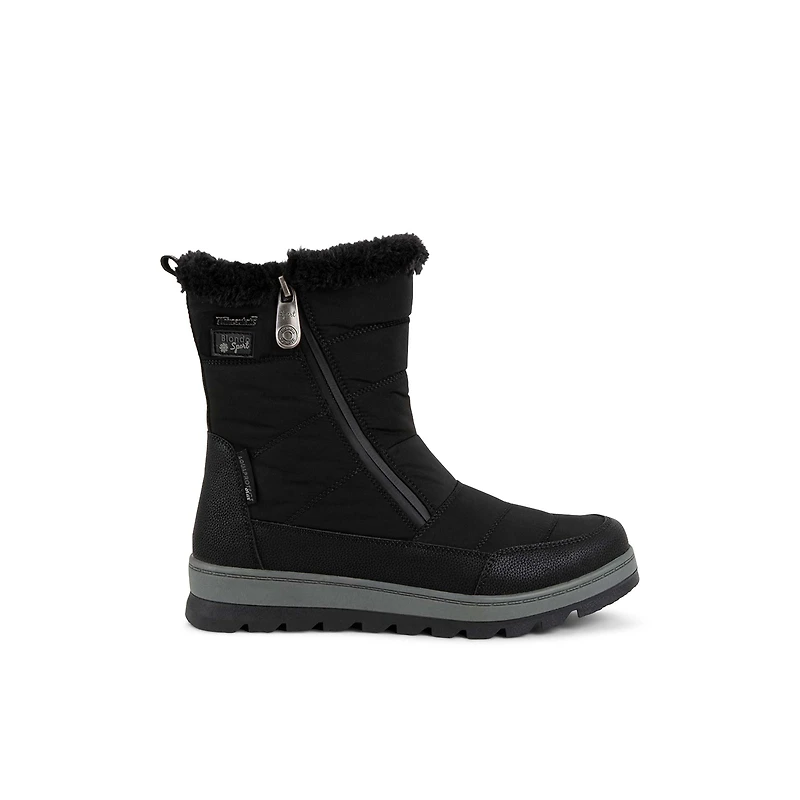 The Blondo BARBARA is a chic, waterproof winter ankle boot built for any weather. It combines a Pebble Eco Nubuck and nylon upper with a cozy faux-fur snow collar and curly-pile lining. Dual side zippers make it easy to slip on, while a removable anti-bacterial carbon insole and 3M™ Thinsulate™ insulation (rated to about –31 °C / –25 °F) keep your feet warm and fresh. A lightweight dual-density rubber outsole provides traction and comfort, and the boot features a 1.25″ heel, a 7″ shaft, and a 12″ shaft circumference in women’s size 7.