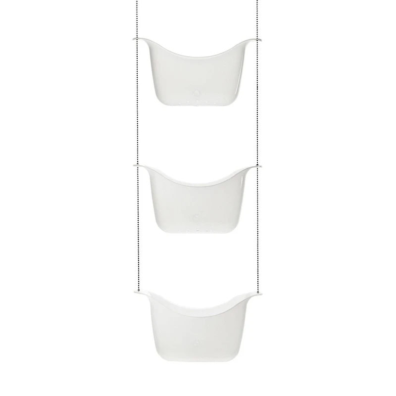 The Bask shower caddy by Umbra is a fun way to hold your shampoo, conditioner and other bath products. This caddy is a set of three polypropylene caddies, suspended with a stainless steel ball chain and 2 hooks for either over the shower head or the curtain rod. The baskets have small holes in the bottom to allow water to drain through, keeping the baskets free from water and scum build up. The Bask Shower caddy is 36.25-Inch long fully extended, allowing for plenty of space in between baskets for all size bottles. The Bask Shower Caddy is great for adult and children's bathrooms alike. Perfect for apartment living too Clean up your shower and get organized with the Bask shower caddy. Designed by David Quan for Umbra- original, modern, casual, functional and affordable design for the home.