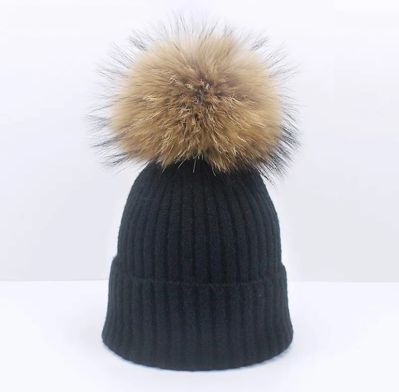 Fashion lovely knitted hat with removable real raccoon PomPom