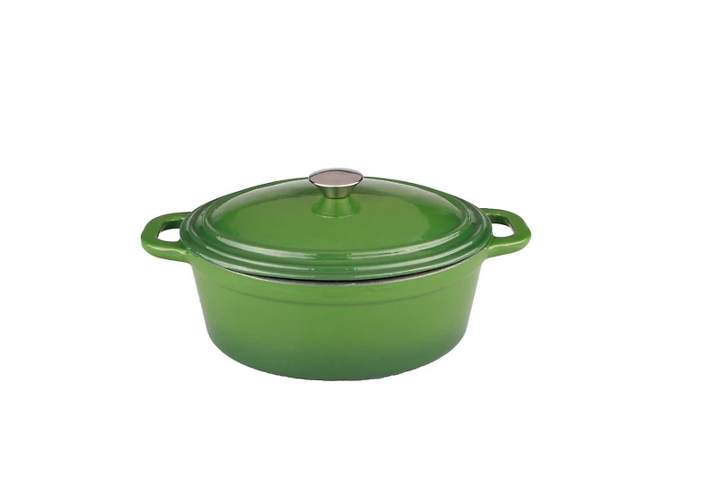 The BergHOFF Neo oval cast iron-covered casserole dish serves up to 8 quarts of all your delicious meals. With great heat retention and oven safe up to 400F it makes a durable and multi-functional addition to any cookware set. Featuring European design and a fresh green finish it will be sure to meet all your cooking needs.