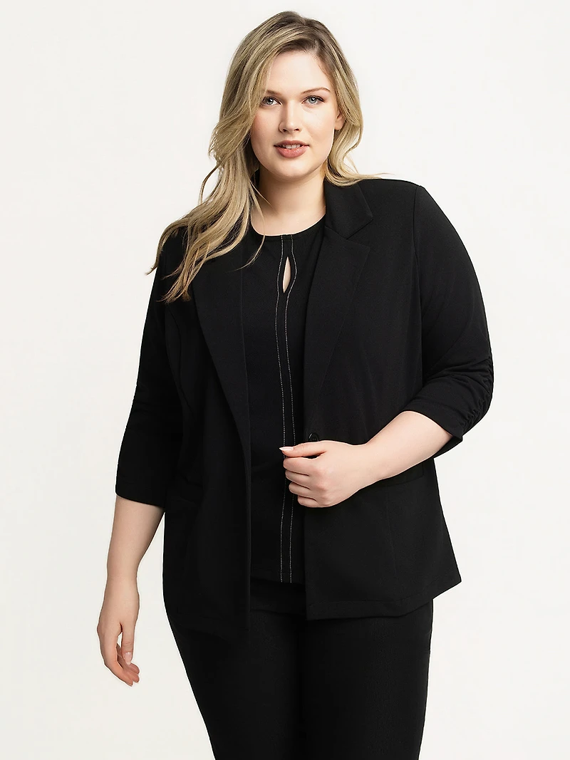 Blazer made of solid woven fabric, featuring a notched lapel collar and long sleeves gathered to a three-quarter length. It includes a single-button closure, front patch pockets, and a hip-length finish.