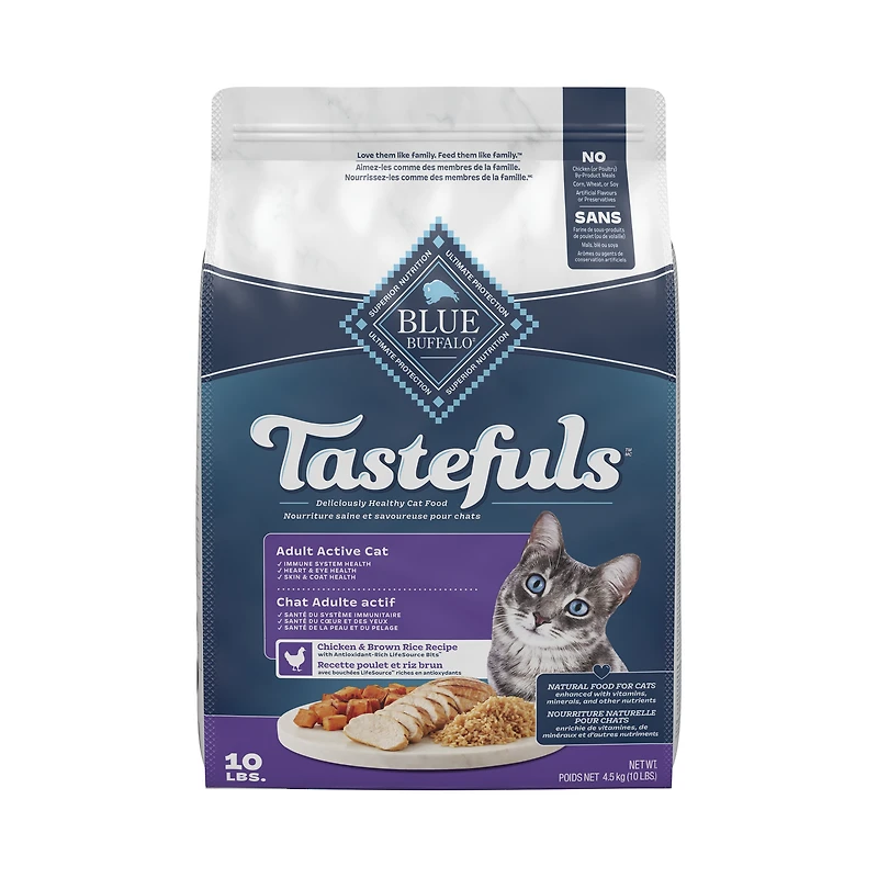 Blue Buffalo Tastefuls Natural Dry Cat Food for Active Adult Cats is a delicious dry cat food with real chicken as the first ingredient. A great choice for cat parents who want to prioritize natural ingredients while pleasing picky palates, this Blue Buffalo dry cat food is made without any chicken (or poultry) by-product meals. It's also free of corn, wheat, soy, and artificial flavors and preservatives. BLUE Tastefuls cat food is packed with naturally tasty ingredients and key nutrients to support digestive care, maintain heart health, and provide energy for active cats. This natural cat food will keep your cat purring for more!