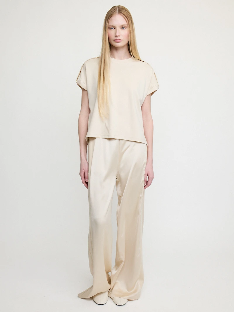 Boxy top featuring structured shoulders and a distinct piped trim along the shoulder. A versatile choice, suited for both casual ensembles and more refined combinations. Offered in different shades to suit various personal styles and creative expressions. Composition: 62% Viscose 32% Polyamide 6% Elastane  Made in Italy.