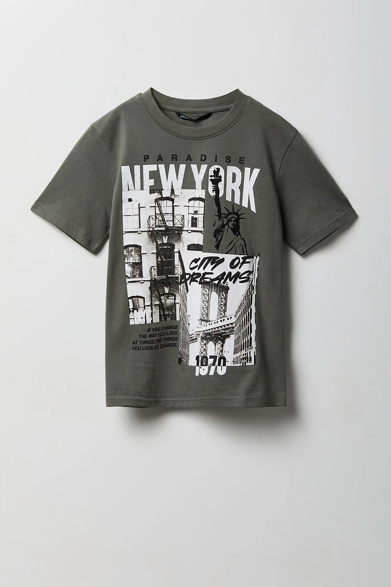 This t-shirt features graphic front, crew neckline, and short sleeves.