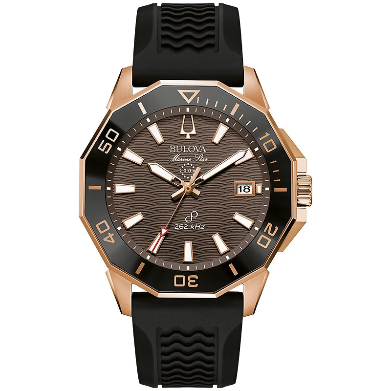 An incredibly bold design, this men’s Bulova Marine Star Precisionist sport watch pushes the limits with Bulova’s cutting edge technology and a strikingly modern case. Defined by a rugged, angular profile, the 43mm rose gold-tone stainless steel case features brushed facets and polished accents, with a unidirectional timing bezel with a ceramic insert, a sapphire crystal, and a screw-down crown ensuring 200m water resistance. The rich brown dial takes its inspiration from the undulating crests of the ocean, with a wave pattern accented by applied hour markers and a bold handset, all featuring luminescent material for unrivaled legibility in all conditions. A date window is position at 3 o’clock, while the red-tipped seconds hand brings a subtle pop of colour and sweeps smoothly around the dial thanks to Bulova’s proprietary Precisionist movement, a revolutionary 8-jewel quartz mechanism vibrating at a remarkable 262kHz and accurate to 10 seconds per year with increased resistance to temperature changes. Paired with a durable silicone strap with a pin buckle closure, this men’s Bulova timepiece is equipped to handle everything from the office to the ocean.