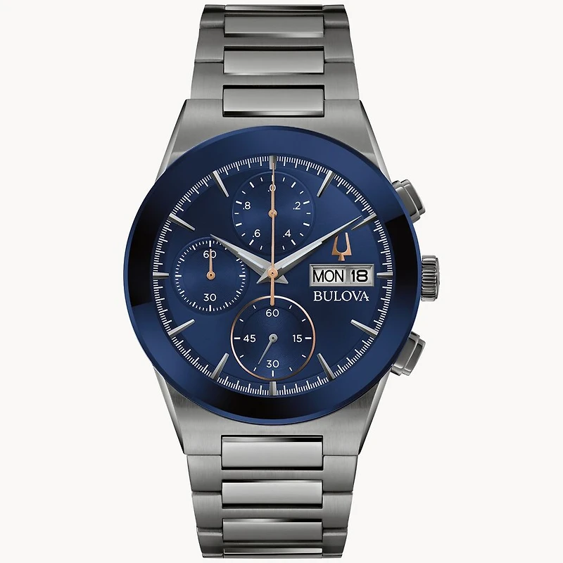 Form and function are blended flawlessly in the sophisticated chronograph watch from the Bulova Modern Millennia men’s collection. This state-of-the-art timepiece features a stainless steel metalized blue and grey case, and the blue 3-hand dial with date features 3 chronographs – a dial to register elapsed time, a minute dial, and an hour dial, allowing the wearer to measure time with precision. The grey stainless steel bracelet is fastened by a deployant buckle with pushers. This elegant, yet highly-functional watch will appeal to your modern sense of style. Calibre: 0S00