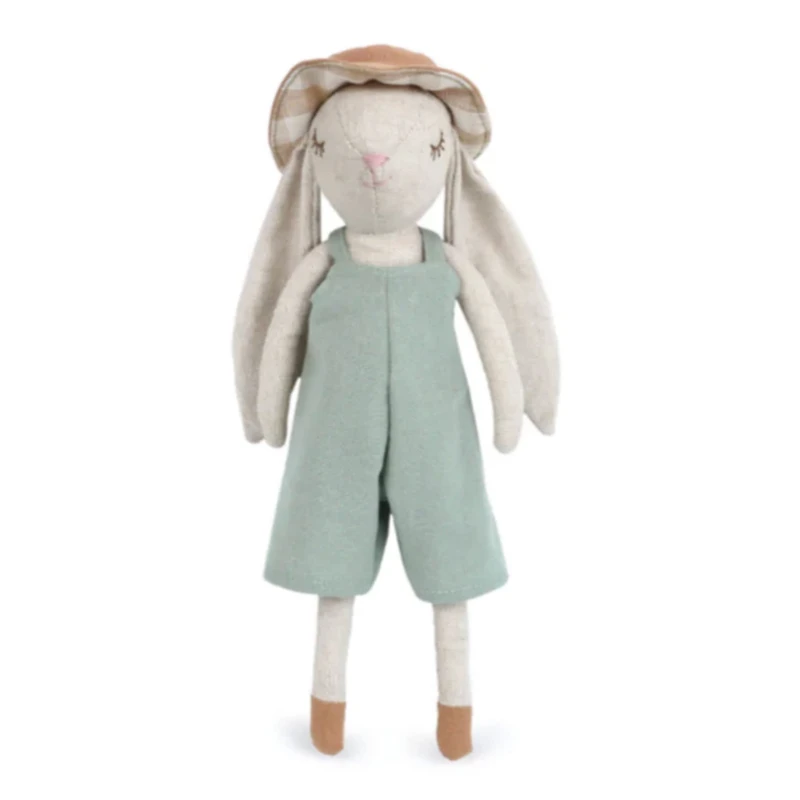 Hop into Easter with Mon Ami's delightful Mr.Hopper Bunny! This charming, one-of-a-kind bunny is here to bring extra joy to the season! Lovingly crafted from soft linen -like material that's gentle on little ones' sensitive skin, Mr. Hopper Bunny sports a whimsical sage colored overall and a gingham sun hat, perfect for sunny spring adventures. With its sweetly embroidered face, long floppy ears, and irresistibly cuddly body, Mr.Hopper Bunny is sure to hop straight into your heart. Make your Easter baskets extra special with this enchanting, snuggle-ready companion!