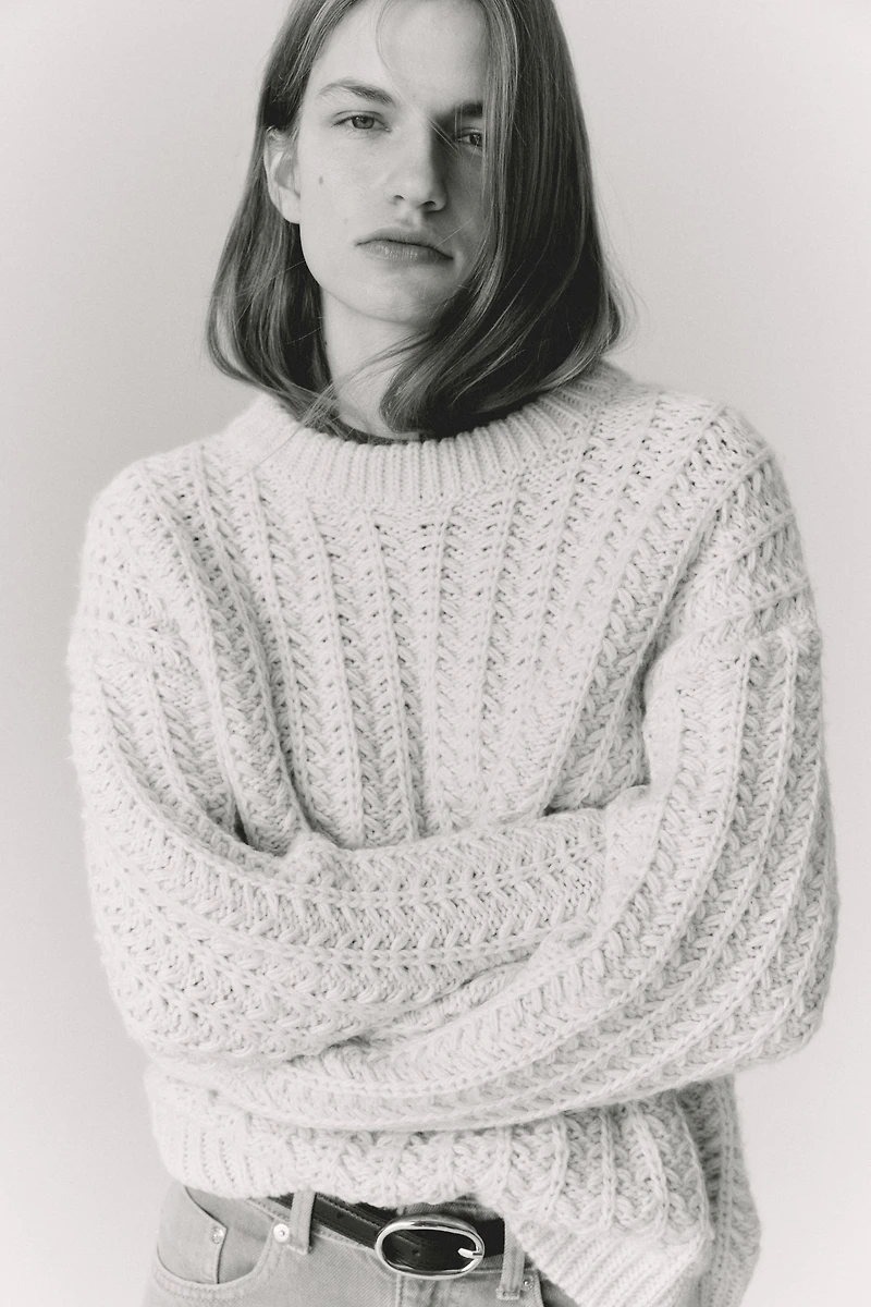Soft cable-knit sweater. Round neckline, dropped shoulders, and long sleeves. Ribbing at neckline, cuffs, and hem.