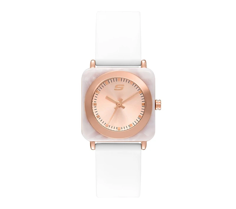 Elegant form meets reliable function in the Skechers Calabar Watch. This splash-resistant design features a chic square 32mm case with rose gold sunray dial, a three-hand quartz movement for superior accuracy, durable mineral crystal lens, and a sleek white silicone strap for ultimate comfort.