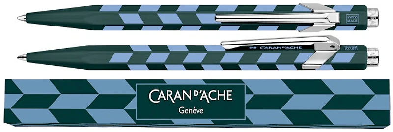 Hexagonal aluminum body, lightweight and durable Satin-finish spruce green lacquered body with a blue-gray stamped geometric pattern Designs with two-tone geometric patterns Clip and push button: Nickel-plated steel Compatible with all Caran d'Ache Goliath ink refills Swiss made
