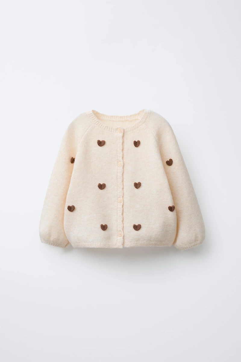 Knit jacket with round neck and long sleeves. Front button closure. Heart appliqué.