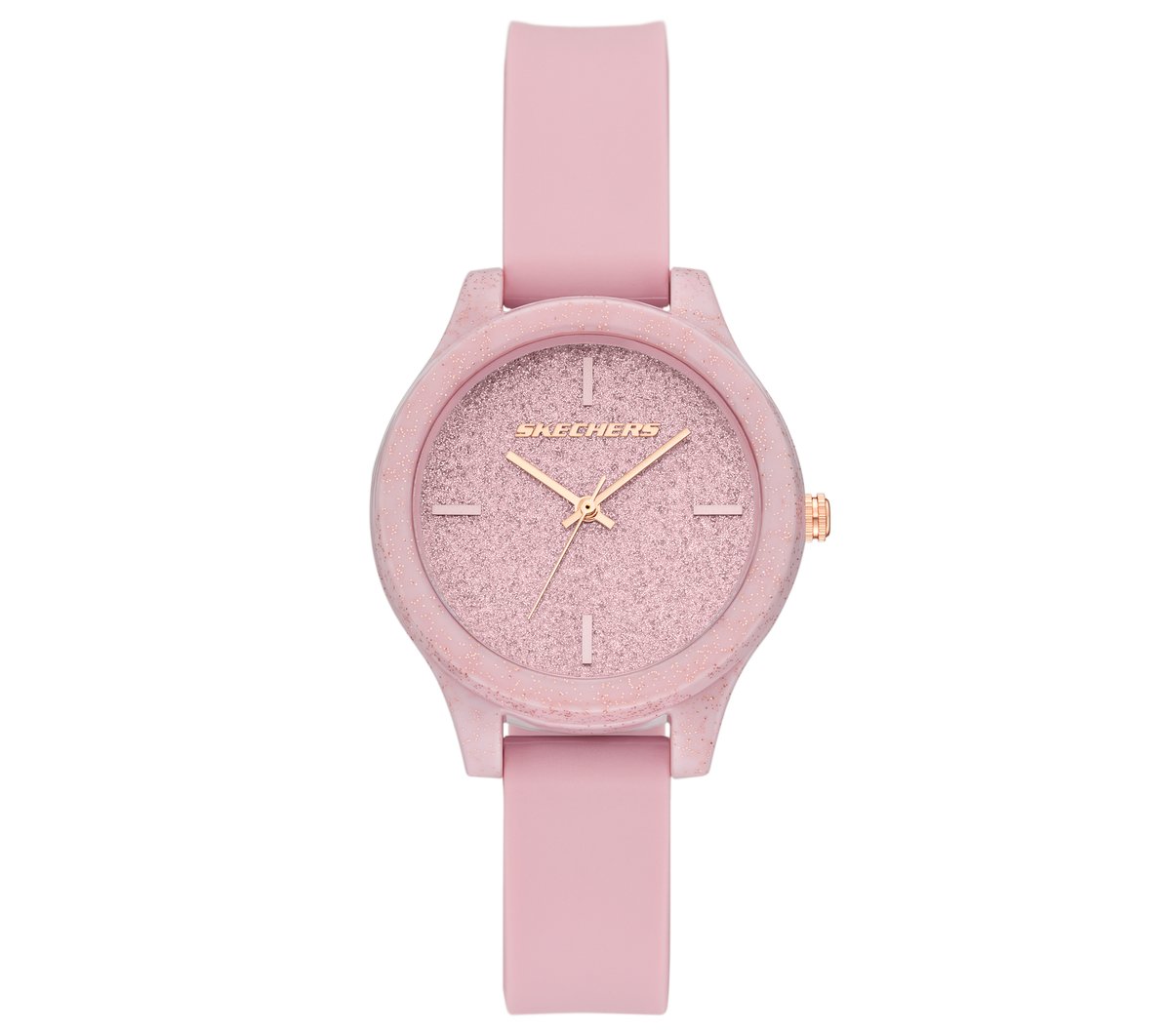 Add sparkle to your day with Skechers Carmelina Watch. This analog fashion watch features a round 35mm case with a glittery dial and rose gold accents, PC and stainless steel construction, and an adjustable silicone strap with rose gold buckle. A great way to add colorful fun to your look.