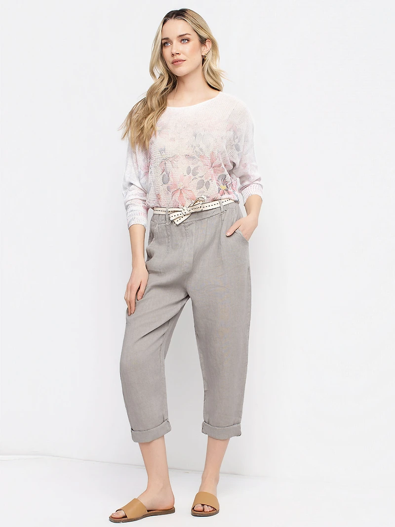 Casual linen pants with a lightly textured surface. They feature a waistband with a tie belt threaded through integrated loops, along with two front pockets and a back flap pocket.