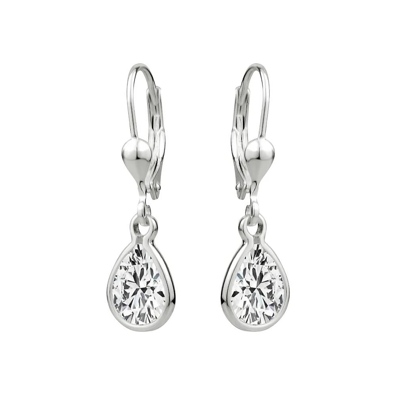 These elegant 26mm drop earrings have a pear-shaped Cubic Zirconia in a bezel setting. The anti-tarnish coating keeps the silver lokoing like new. The closure is leverback.