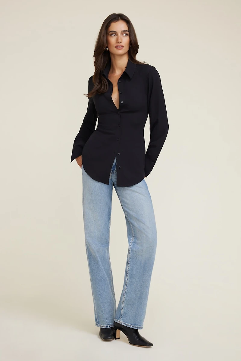 This blouse is made from light, fluid fabric with a dry handfeel. It's designed for a relaxed fit and cinches at the waist for a refined hourglass look. Style it with
