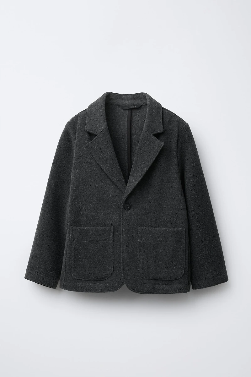 Cloth blazer with lapel collar and long sleeves. Front button closure. Front patch pockets.