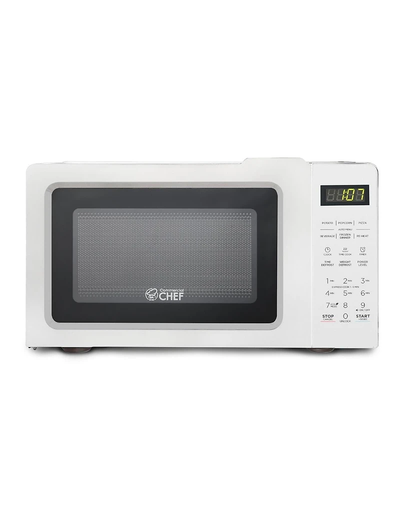 Heat and re-heat your favorite foods and beverages with this outstanding COMMERCIAL CHEF microwave oven countertop. With an impressive capacity of 0.7 cubic feet, this kitchen countertop microwave ensures you heat and reheat delicious meals and beverages to accommodate your busy schedule. The appealing and timeless decor of this sleek white microwave (17.75" x 13.13" x 10.25") will fit easily on kitchen countertops in homes, apartments, RVs, dorms, and more, so consider it a portable microwave! Weighing only 23.1 lbs., you can transport this microwave 700 watt with timer anywhere so heated food and drink is within reach. This microwave one touch has 10 power levels as well Quick Cook Settings to microwave food like pizza, popcorn, frozen dinners, potatoes, and more. With a digital clock and control to program all settings, our countertop microwave with handle will heat from 99 seconds to 99 minutes! It's so easy to select your digital level. Additional features a Cook by Weight and Speed Defrost setting, a convenient recessed handle, child and door lock, 700 watts of power, and efficient turntable that guarantees even heating. What's not to love about this COMMERCIAL CHEF microwave countertop 0.7 cu ft? Its reliable heating ability, impressive functions & settings will have you heating and re-heating throughout your busy day!