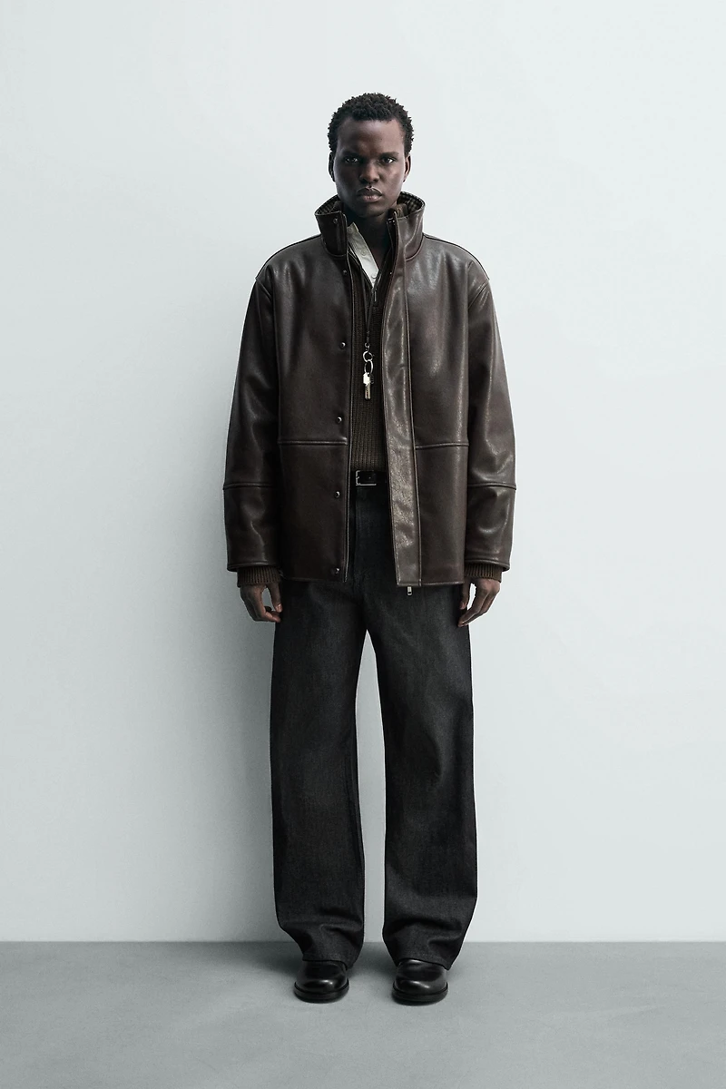 Relaxed fit jacket made of faux leather fabric. High collar with plaid fabric lining. Long sleeves. Welt pockets at hip and interior pocket detail. Front closure with zipper hidden by a snap-button placket.