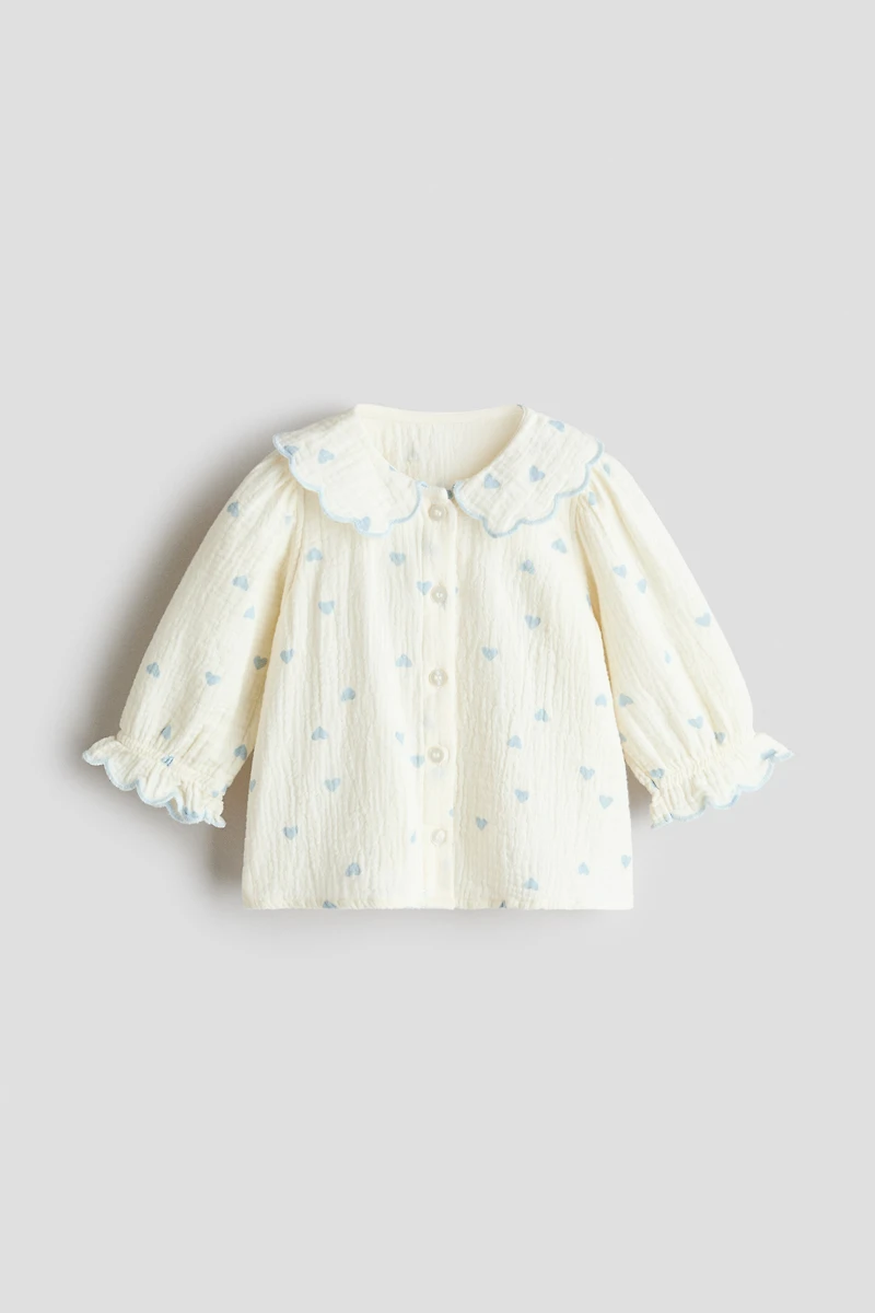 Flared blouse in soft cotton muslin with a printed pattern and trim with scalloped, overlocked edges. Collar, buttons at front, long balloon sleeves, and ruffle-trimmed cuffs with narrow elastic.