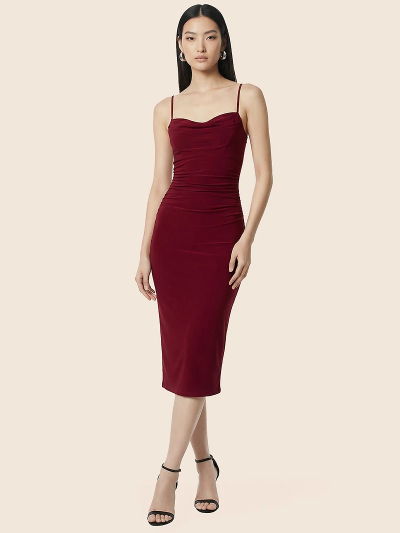 Defined by a softly draped cowl neckline and a sleek, figure-hugging silhouette, this sheath dress delivers effortless polish. Cut in rich merlot tone, it's designed with generous stretch for a smooth, sculpted fits perfect for evenings out and special occasions.