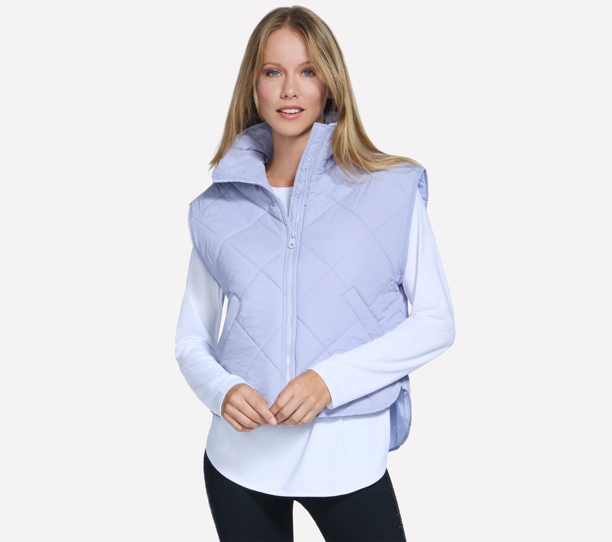 Indulge in effortless style and luxe comfort with the versatile Skechers Cozy Fit® Vest. This puffer is made from our quilted GO SHIELD Cozy Fit™ fabric and features a mock neck, front-zip closure, and front hand pockets.