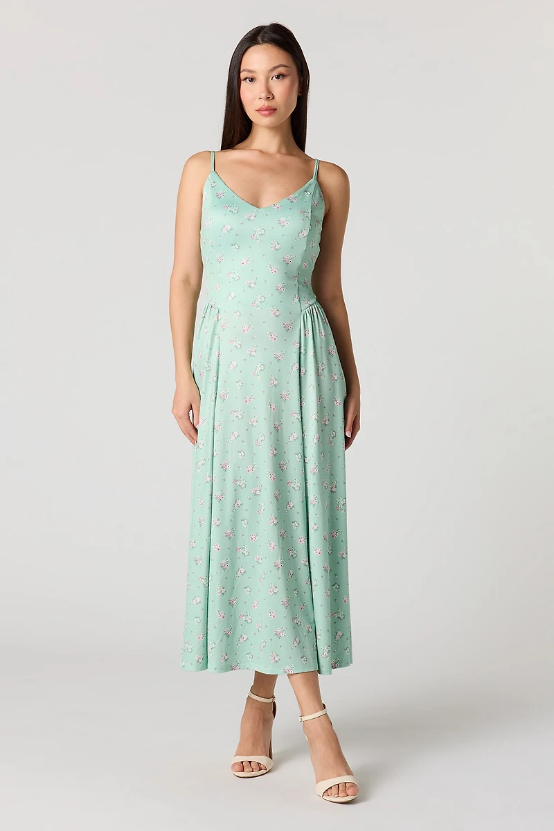 This dress features crepe material, v-neckline, adjustable straps, smocked back, flowy hem and maxi length.