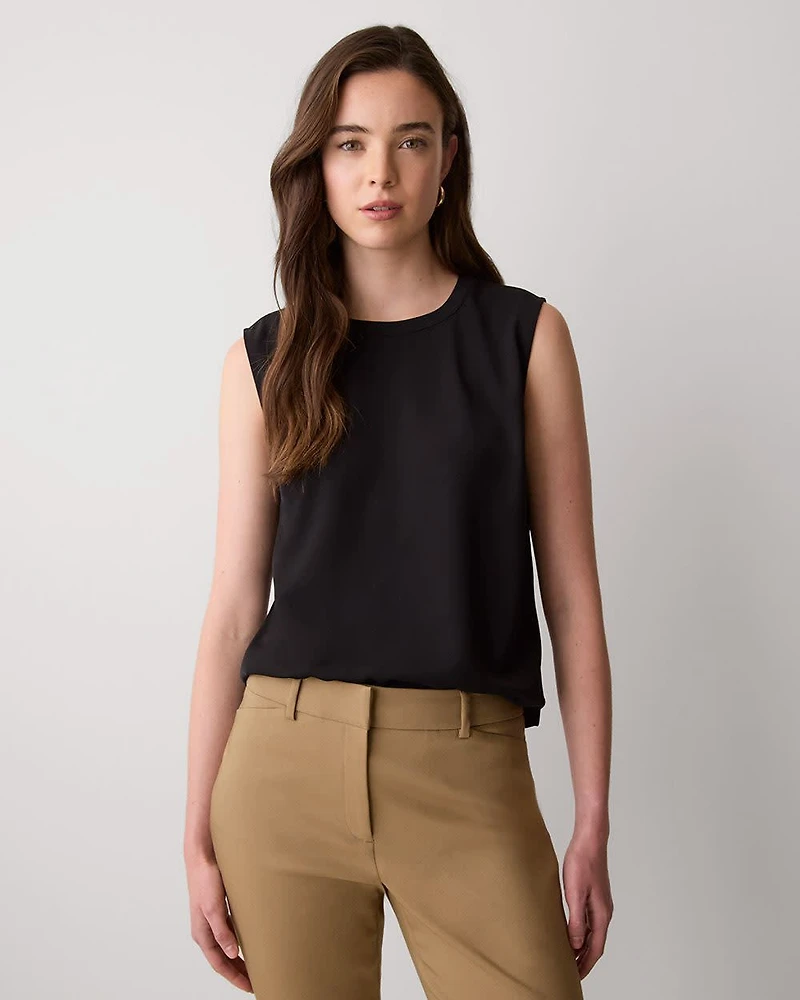 Made in a light fabric, this simple cami featuring a crew neckline is a basic piece that pairs perfectly with any bottom. Fit & Cut - Classic fit: Slightly contours your body with a little extra room - Sleeveless - 24" front body length (size M) Design Details - Satin crepe: contains 60% recycled polyester - Crew neckline - Buttoned keyhole in the back * This garment contains recycled polyester made out of a mix of bottles and fabric waste.