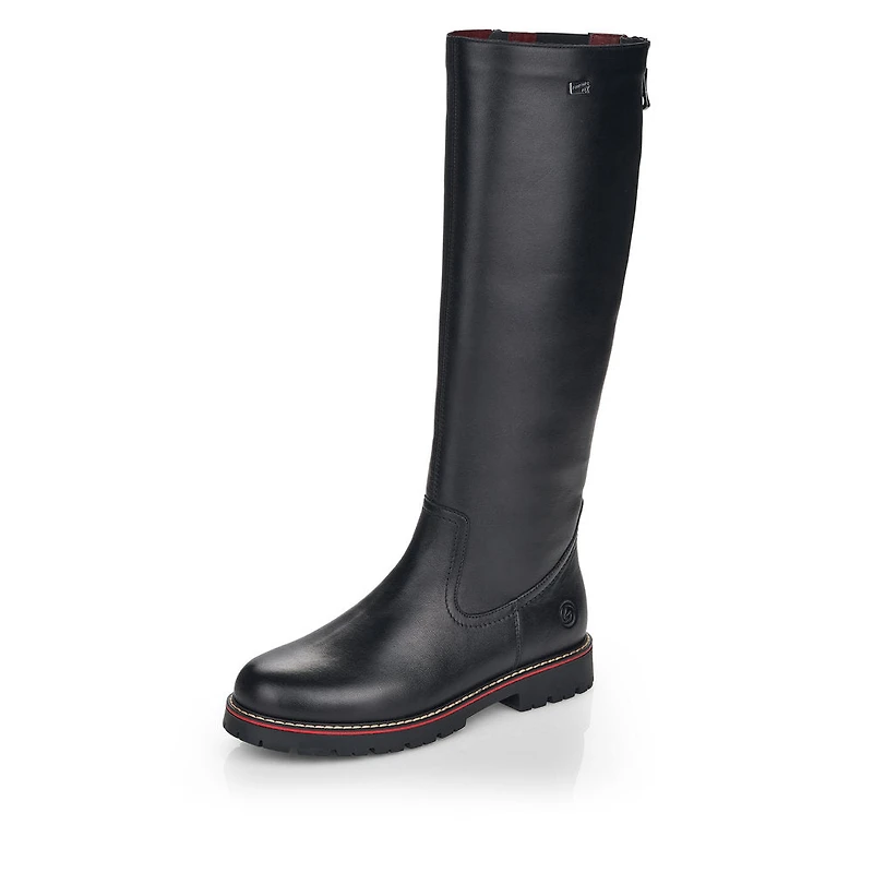 Weniger ist mehr. Mit diesem schlichten, schwarzen Stiefeln in angesagter Reitstiefel-Optik trifft Remonte den Puls der Zeit. Das glänzende Glattleder und der leichte Blockabsatz sind so schlicht wie wirkungsvoll. Die Grip-Sohle mit ausklappbaren Spikes gibt einem Halt auf allen Wegen! Die rote Zwischensohle setzt einen dezenten Akzent. Zeitloses Design plus Komfortfeatures vereint in einem Schuh. Braucht man mehr?