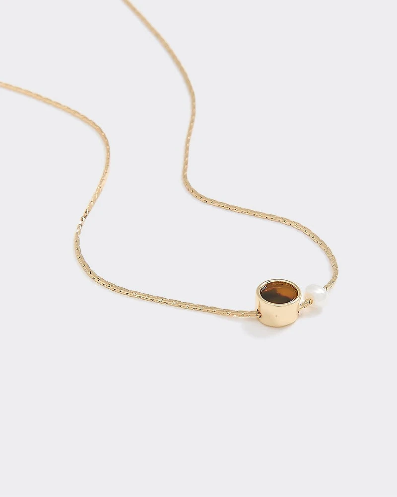 Add a touch of colour to your outfit with this delicate chain necklace adorned with an amber stone and a white pearl.