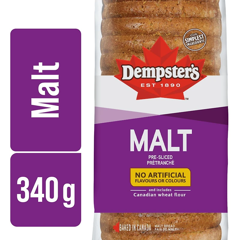 Dempster's® Malt Bread delivers dense, chewy texture and sweet taste in every bite. This delicious bread is made with no artificial flavours or colours.Dempster’s® is proud to continue 100 years of tradition. We bake fresh daily from coast to coast the Canadian way, with dedicated bakers choosing Canadian wheat flour and quality ingredients.FRESHNESS GUARANTEEDYou want the freshest for your family and so does Walmart. Walmart has trained their Associates to pick the best and freshest products to meet your expectations. Satisfaction guaranteed* or your money back! *Terms and conditions apply. See the Online Grocery Help page at Walmart.ca for details.
