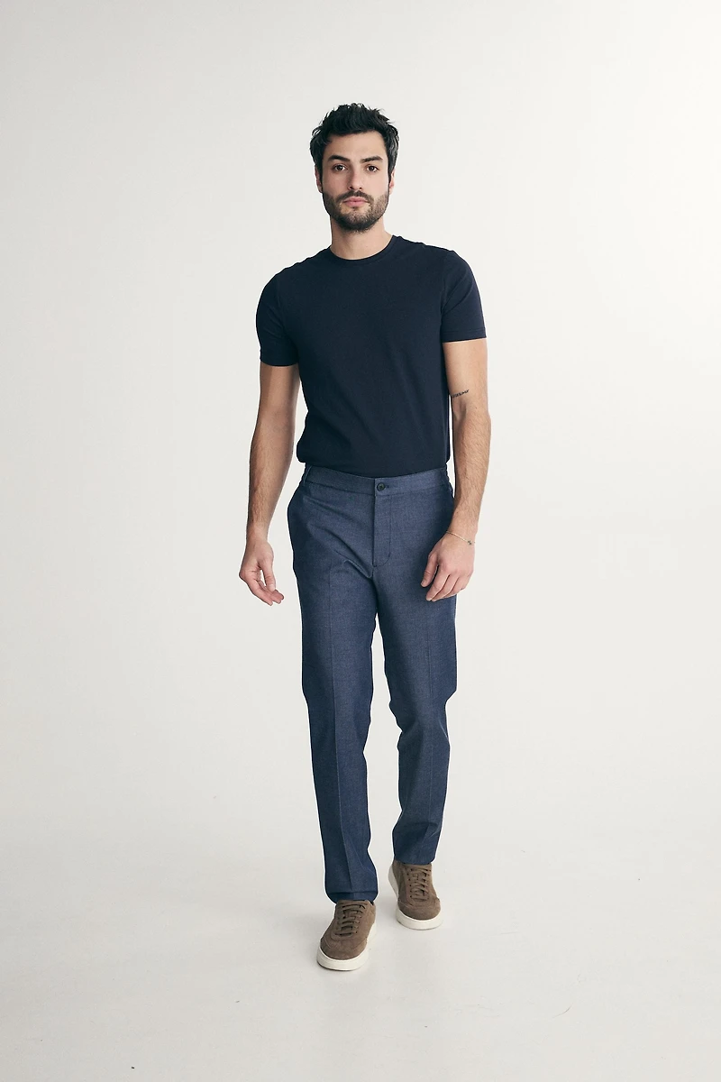 These slim-fit pants combine ultimate comfort with a clean, urban look. Made from a faux-denim fabric and designed with elasticated side panels, they move with you effortlessly. Ideal for everyday wear, they offer a perfect blend of flexibility, modern style, and easy care.