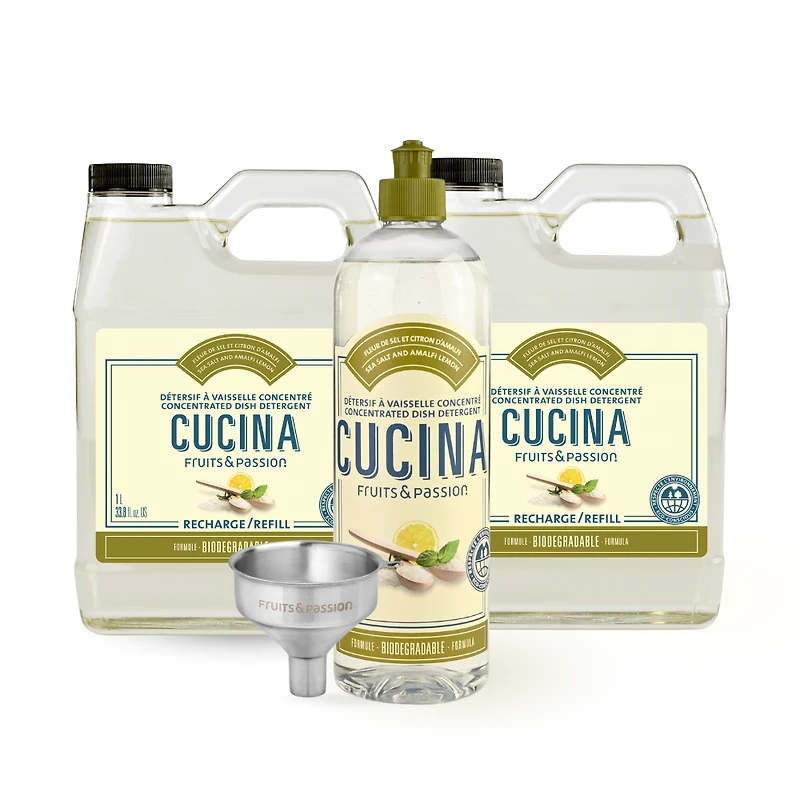 Why customers love this bundle Simplify your kitchen routine with our Dish Detergent Refill Bundle. This set combines two large 1L refills with a ready-to-use 500 ml bottle, making it easy to refill and stay stocked longer. The concentrated formula is biodegradable* and tough on grease while remaining gentle on hands. This bundle includes 4 items + a Free gift: