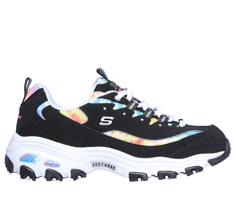 Add a little bit of groovy tie-dye color to a classic sporty look with the SKECHERS D'Lites - Summer Fiesta shoe. Smooth nubuck leather and multi color tie-dye print mesh fabric in a lace up sporty training sneaker design with stitching and overlay accents. Air Cooled Memory Foam insole.