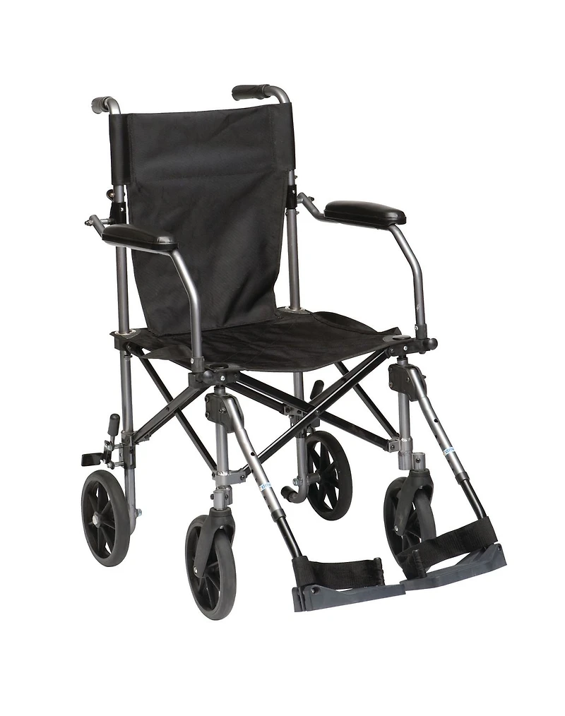 The Travelite Transport Chair in a Bag from Drive Medical is a lightweight yet sturdy aluminum framed portable chair. It is easily transportable and comes with a compact carry bag, making it ideal for stowing away in cars, buses, trains, and more. This wheelchair can be used both indoors and outdoors on forgiving terrain, with a convenient step for the attendant to lift the chair over obstacles. This transport chair gives you the freedom to go, with the added convenience of folding up to a manageable size.