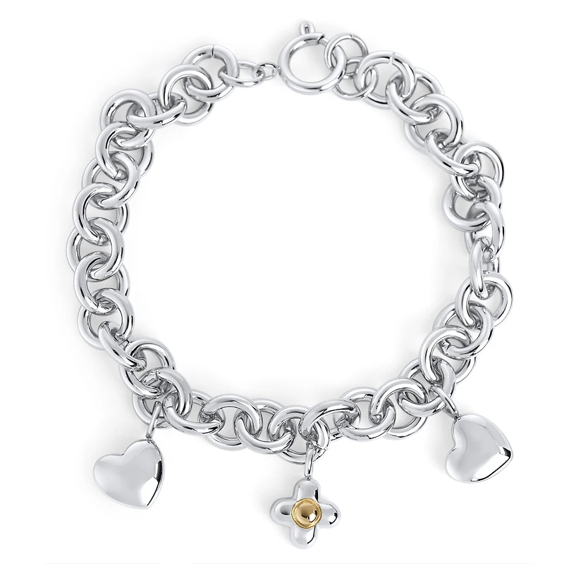 The Eclor Bracelet features a two-tone flower and two delicate hearts, symbolizing beauty, harmony, and tenderness. Each charm is a subtle reminder of your inner strength and the light you bring into the world. A piece to wear as a daily talisman, reminding you to love yourself and shine every day.