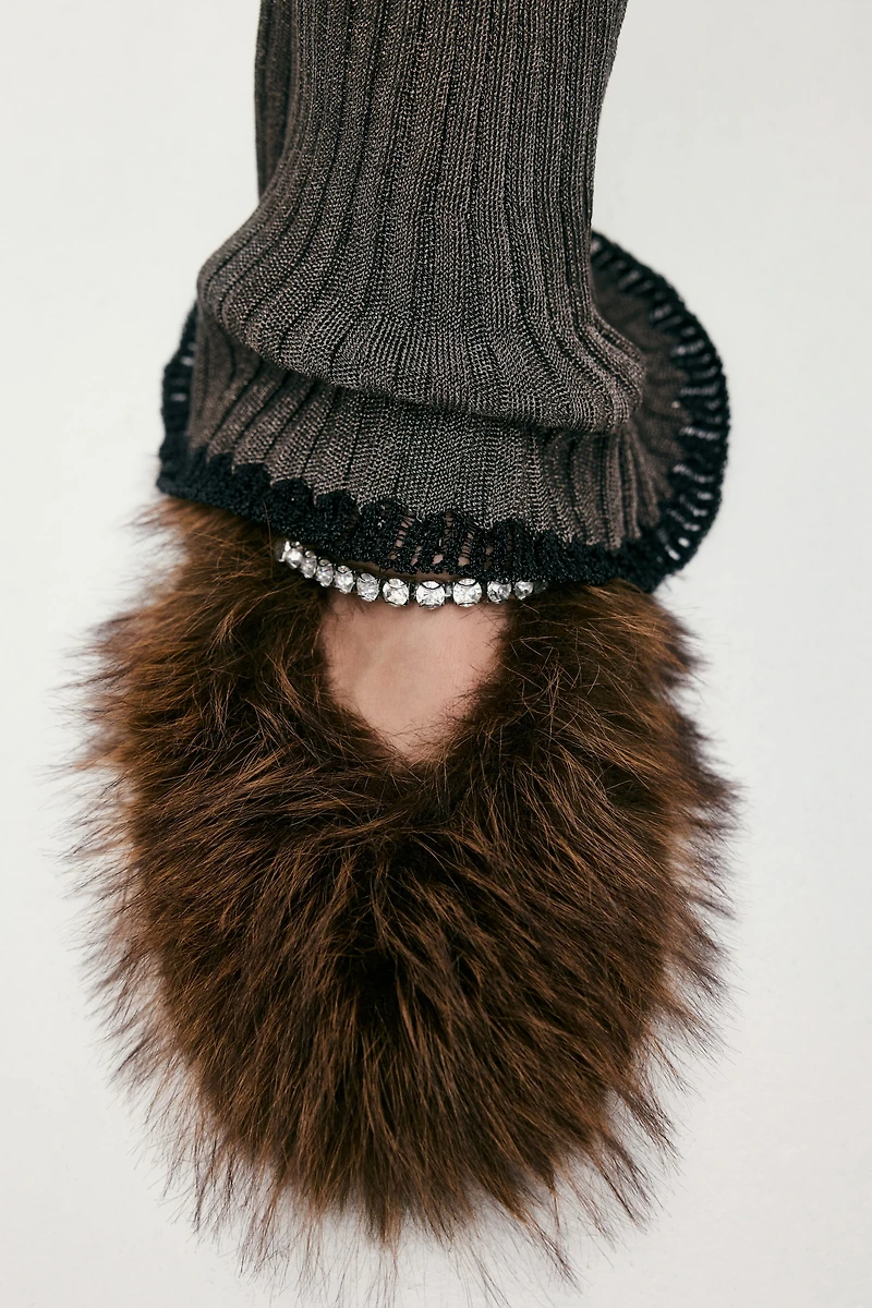 Slippers in soft, fluffy fabric. Elasticized foot strap embellished with sparkling rhinestones. Satin lining.