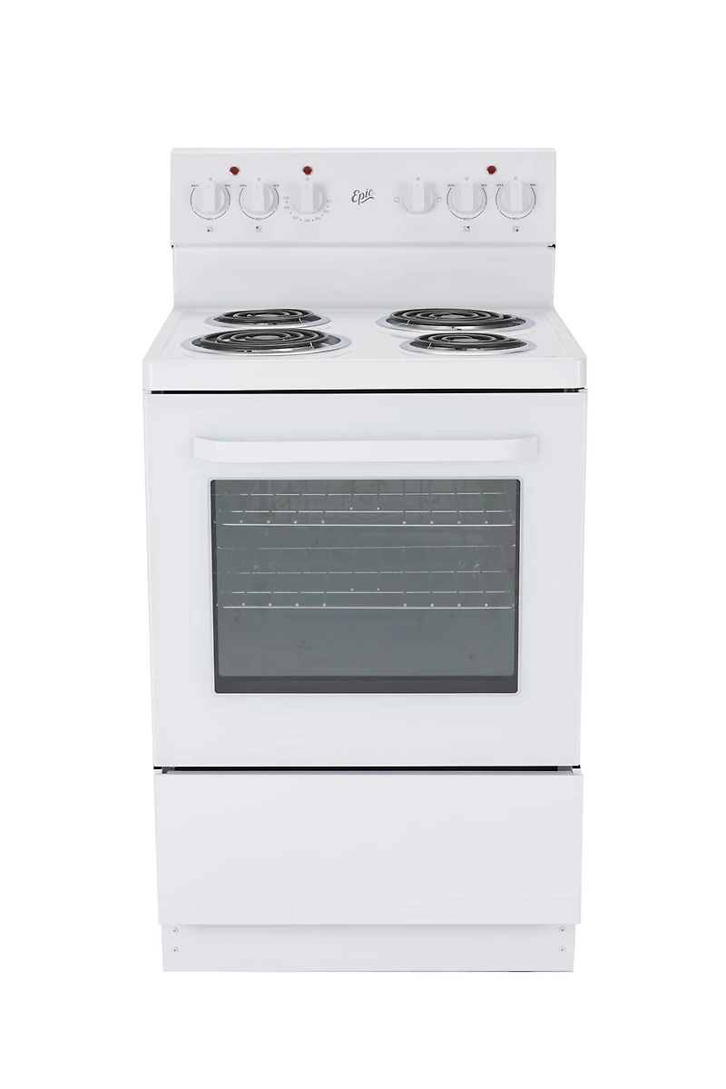 Perfect for the cottage, apartment or wherever space is tight, this Epic 24” wide contemporary style range features 2-6’’and 2-8’’ coil burner elements with chrome burner bowls. Bake or Broil in the spacious 2.7 cu.ft. easy clean oven with up-swept porcelain lift-up cooktop, storage drawer, hidden bake element and removable door for cleaning.