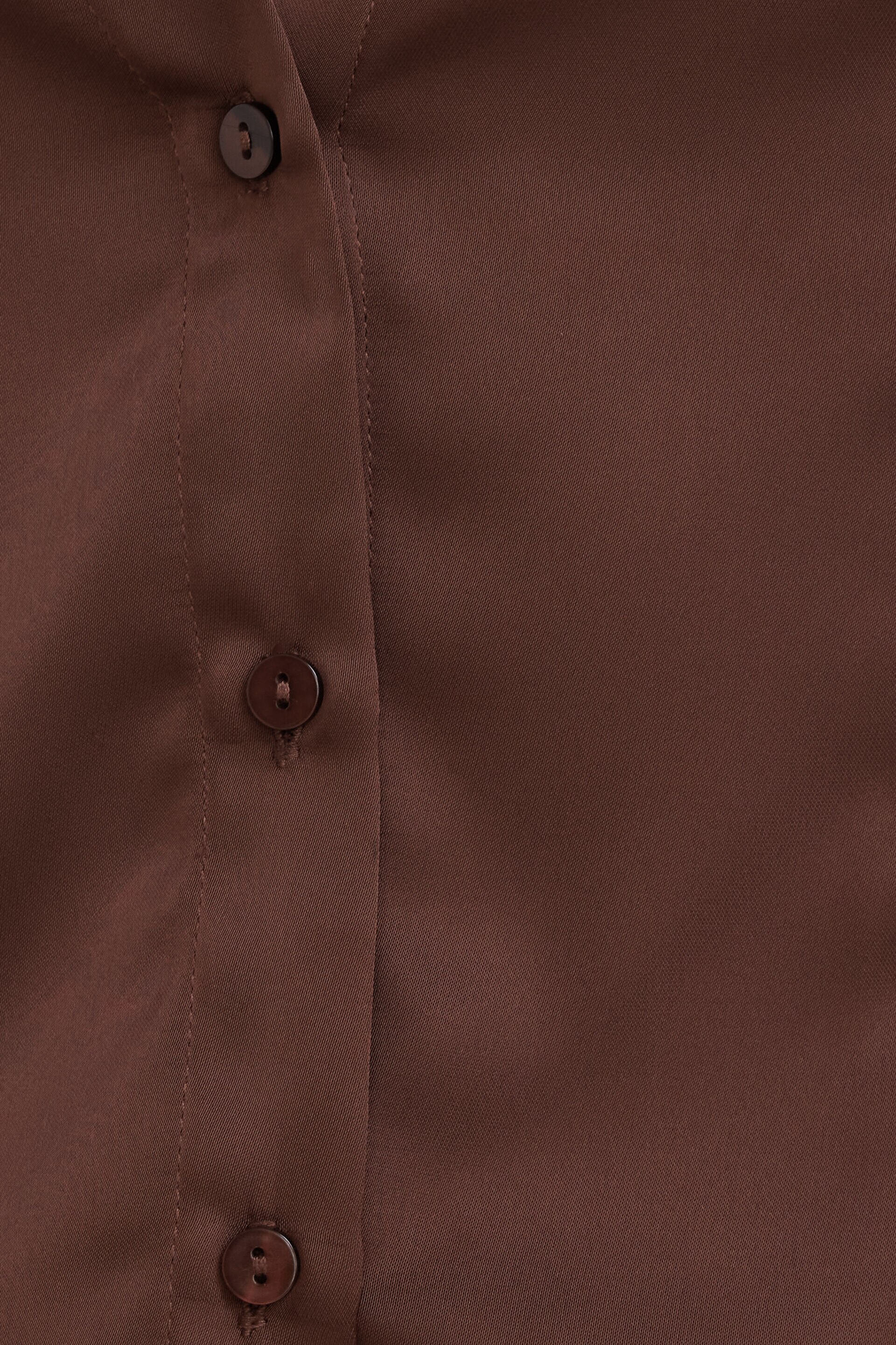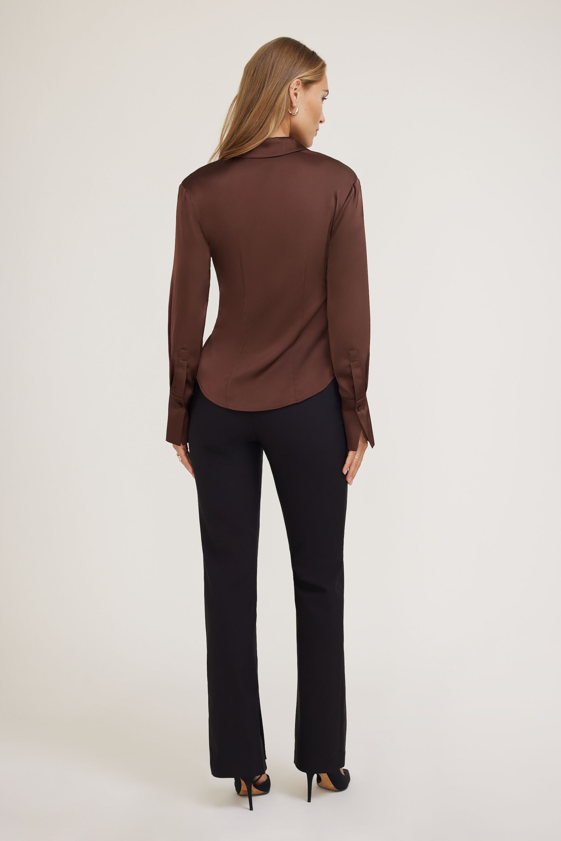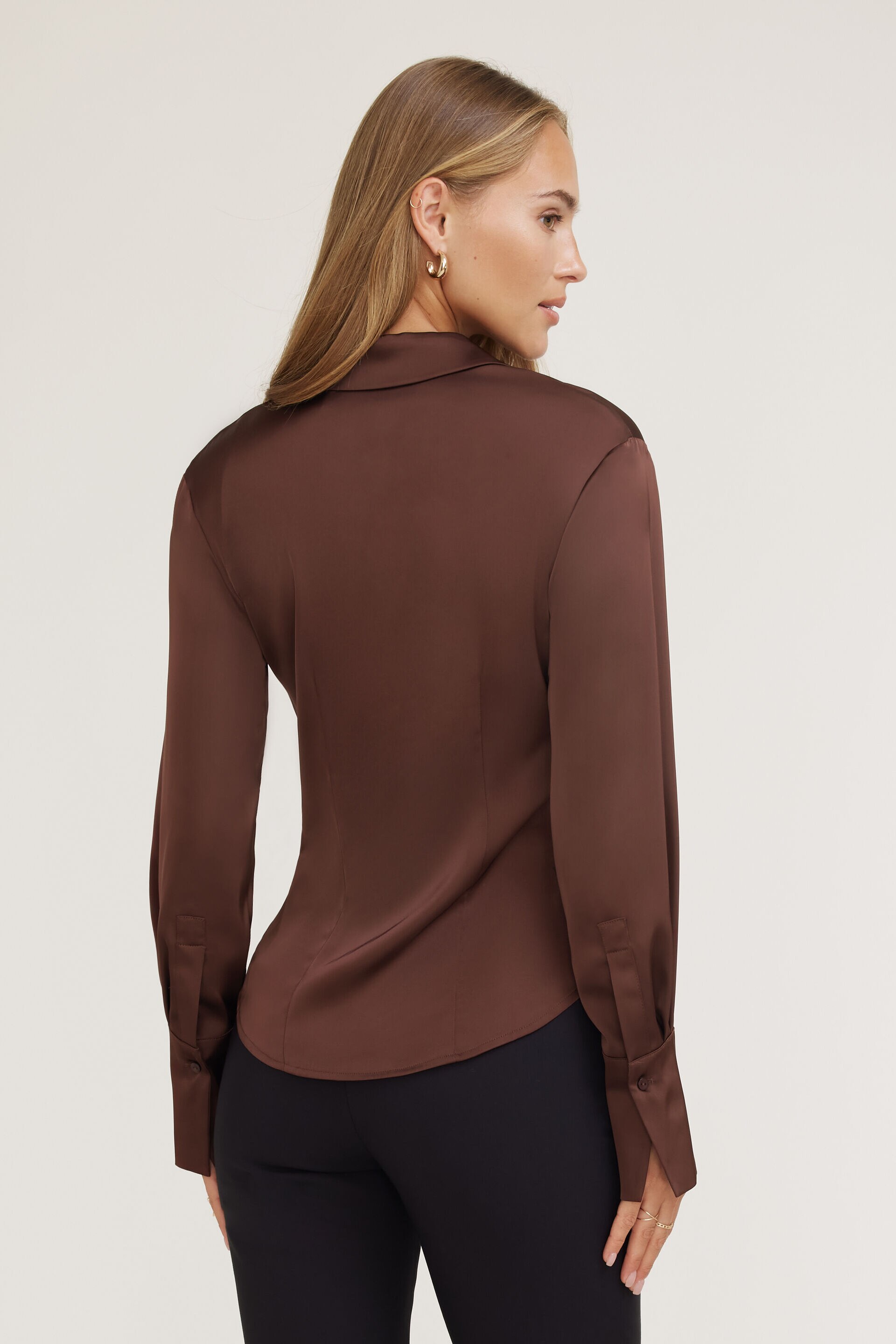 This shirt is made from flowy, silky satin that's super soft to the touch with just a bit of stretch to move with you. It's designed for a fitted silhouette and has large cuffs for a little flare. Style it with