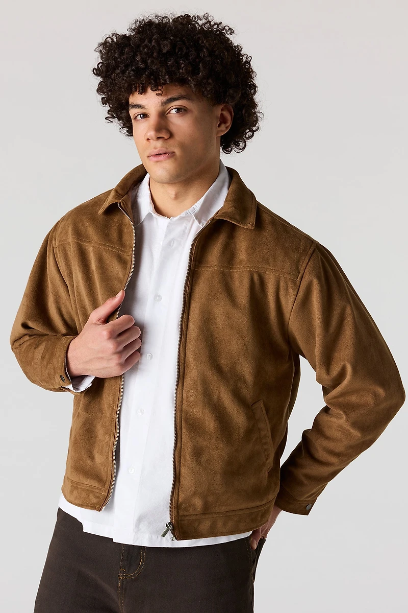 This jacket features faux-suede material, collared neckline, zip-up front, slide-in pockets, long sleeves, and buttoned cuffs. Model: 6'0" in a size M Shell: 90% Polyester 10% Spandex | Lining: 100% Polyester Hand Wash in Cold - Wash Dark Colours Separately - Do Not Wring or Twist - No Bleach - Lay Flat to Dry Imported