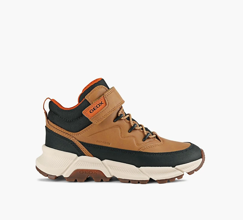 Built for adventure, the Geox Flexyper Plus ABX shoes are made to handle wet, cold, and rugged conditions. With a waterproof and breathable construction, these kicks feature a waxed leather-effect and nylon upper, a warm lining, and a lightweight rubber sole with deep flex grooves for superior grip. The elastic laces and riptape strap make them easy to slip on and secure—perfect for active kids on the move.