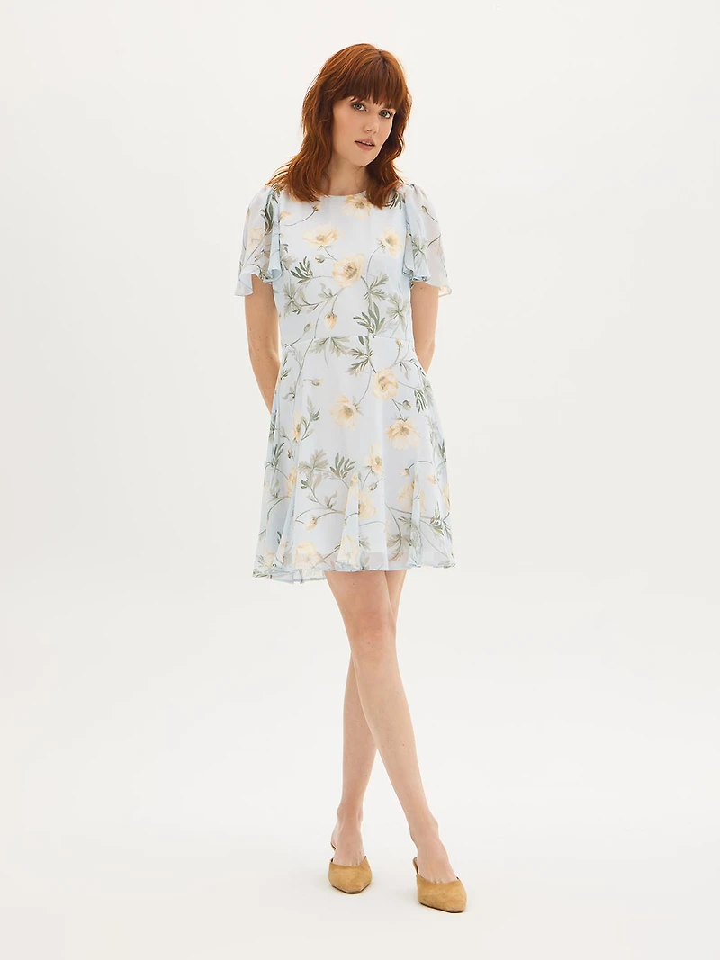 Light, playful, and made to move. This floral mini brings softness through flutter sleeves and fluid chiffon, balanced by a clean silhouette that feels modern and easy. It's the kind of dress that works for daytime plans, weekend events, and nights that start casual and end somewhere better. Woven dress Floral print Textured chiffon Round neck Back zip closure Short flutter sleeve Mini skirt with gusset detail on hemline Lined Model is wearing size XS Fabric: 100% polyester Lining: 100% polyester Machine wash inside out in cold water Hang to dry