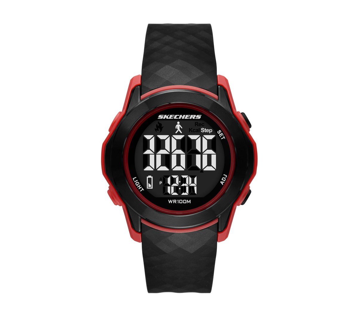 Elevate your everyday style with the Skechers Galloway Watch. This lightweight design features a round 47mm polycarbonate case with an easy-to-read negative display, a digital movement for precise timekeeping, a durable mineral crystal lens, and a comfortable black plastic strap. Water resistant up to 100 meters.