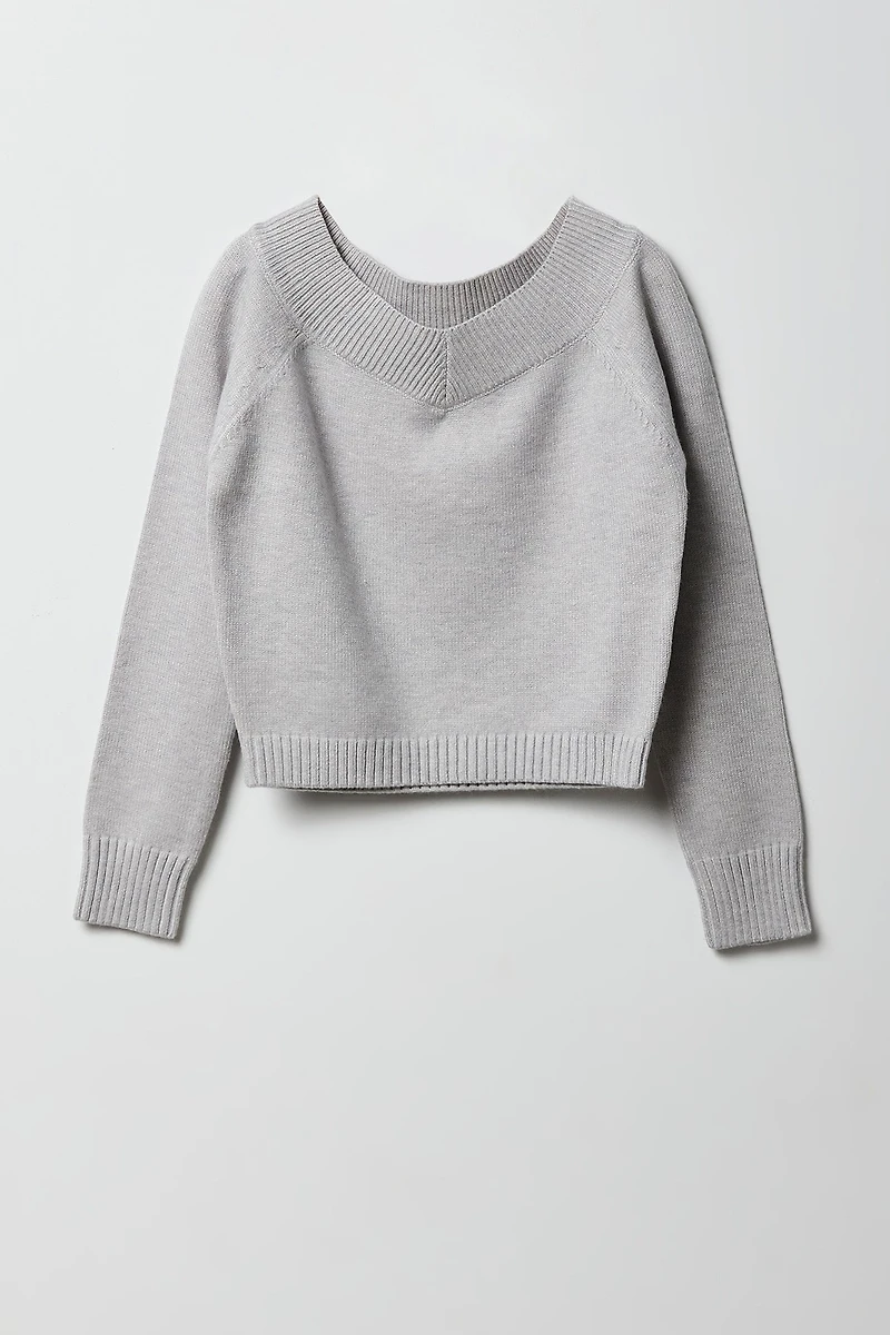 This sweater features knit material, v-neckline, long sleeves and ribbed trim.
