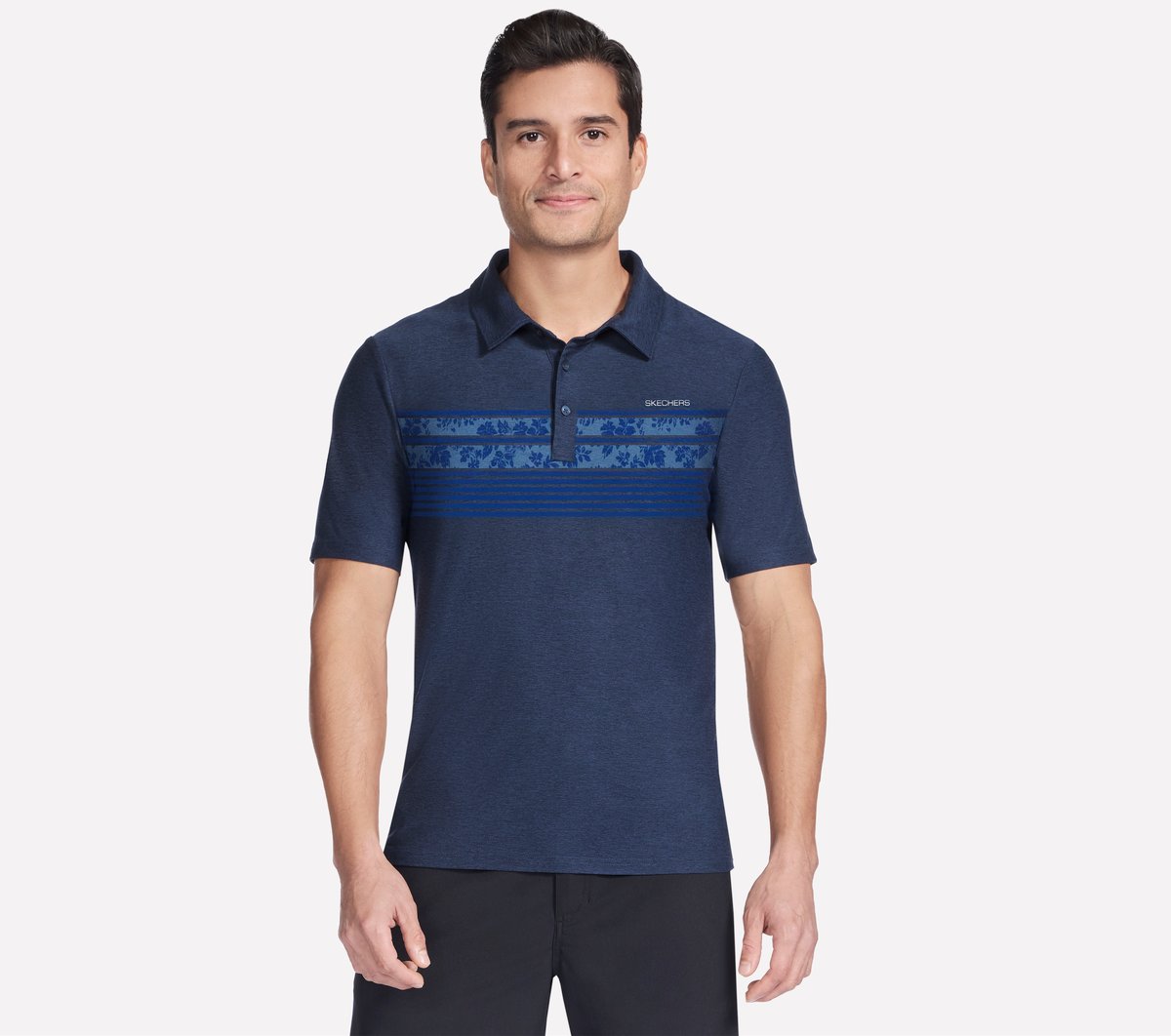 Good-natured comfort and style combine in the essential Skechers GO DRI® All Day Links Polo. Designed with recycled materials, this short sleeve polo is made with our lightweight GO DRI® ALL DAY jersey fabric and features stripe graphics across the chest, a self-standing collar, and a 3 button placket.