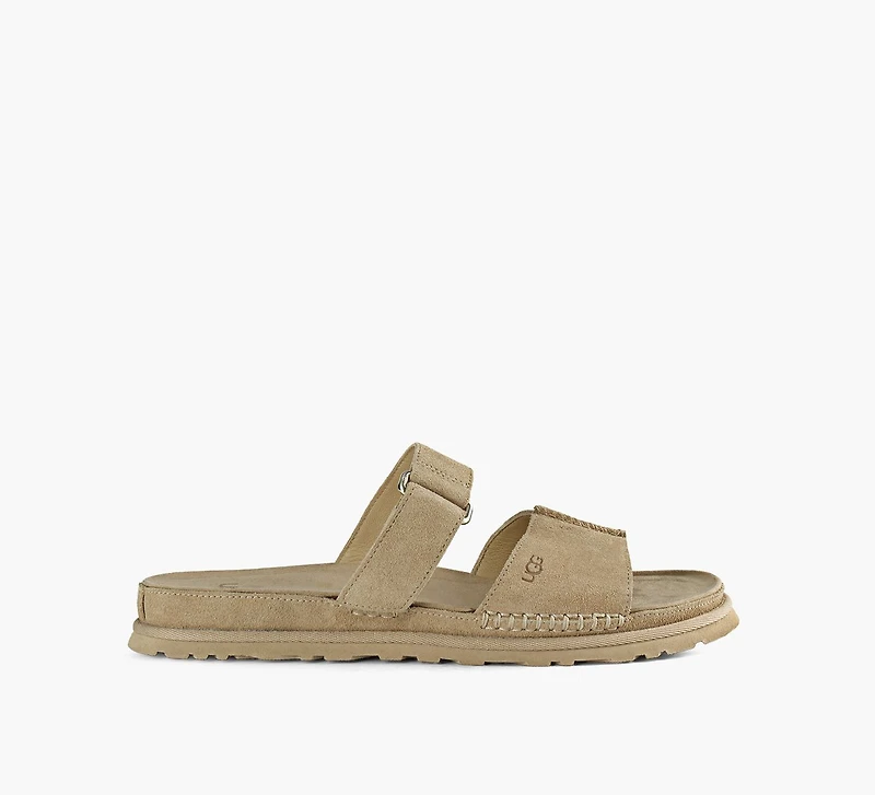 UGG’s GoldenGlow Slide brings easy, sun‑ready energy to everyday wear. Three adjustable straps in soft recycled textile secure the foot, while a springy sugarcane‑EVA platform adds lightweight lift. Airy, cushioned, and endlessly versatile, it’s the bright, feel‑good slide made for warm‑weather wandering.